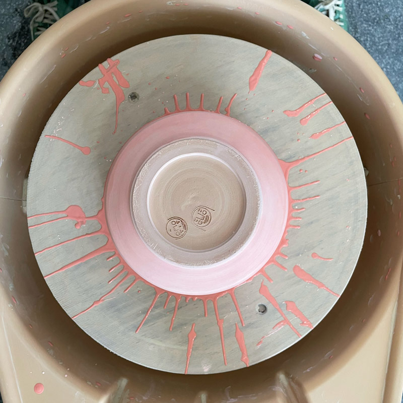 Die getöpferten Rohlinge (hier mit Engobenfärbung im Inneren) trocknen nach dem Trimmen mindestens für eine Woche, je nach Wandstärke. Erst wenn sie ganz durchgetrocknet sind, dürfen sie in den Ofen.